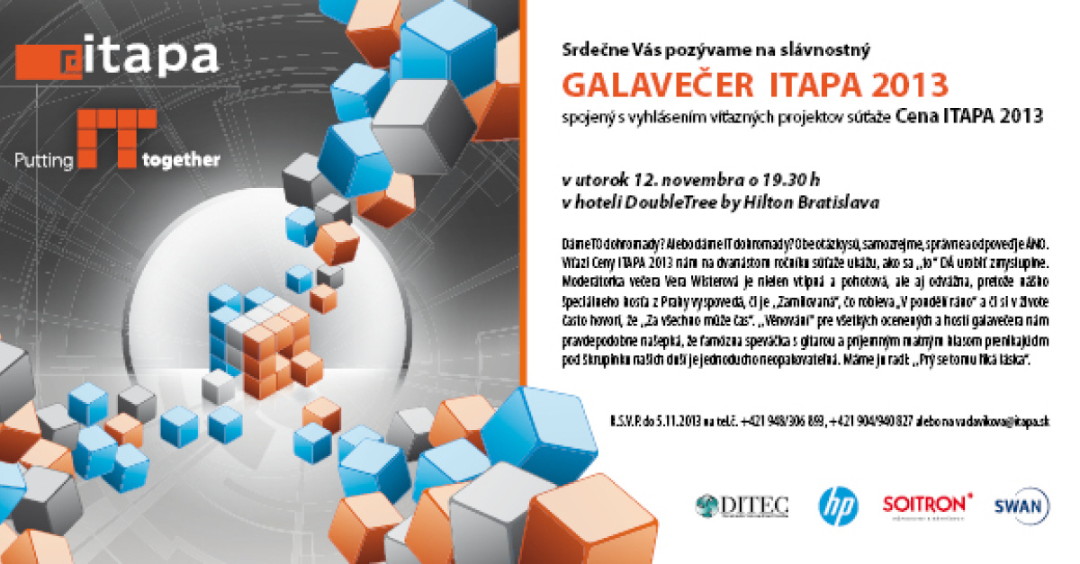 Z komentárov do nedeľe 24:00 vylosujeme v pondelok doobeda voľný lístok na Galavečer ITAPA 2013.